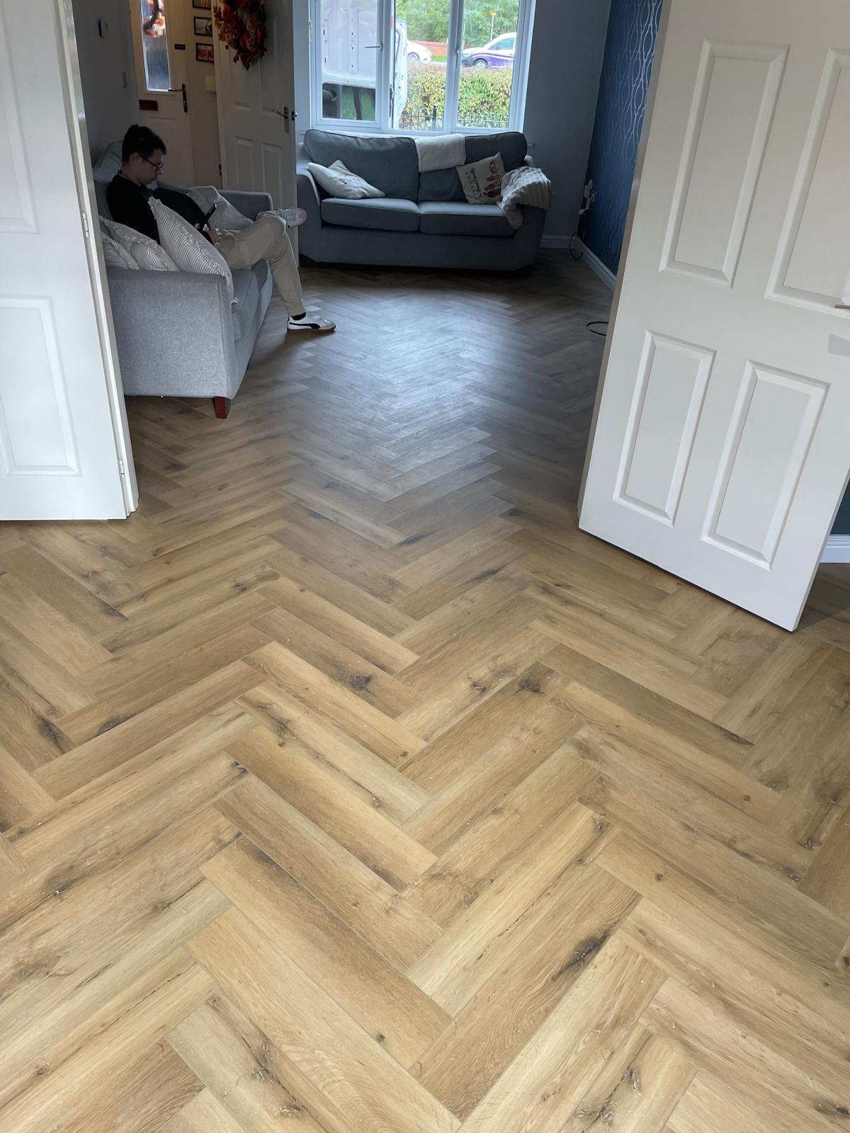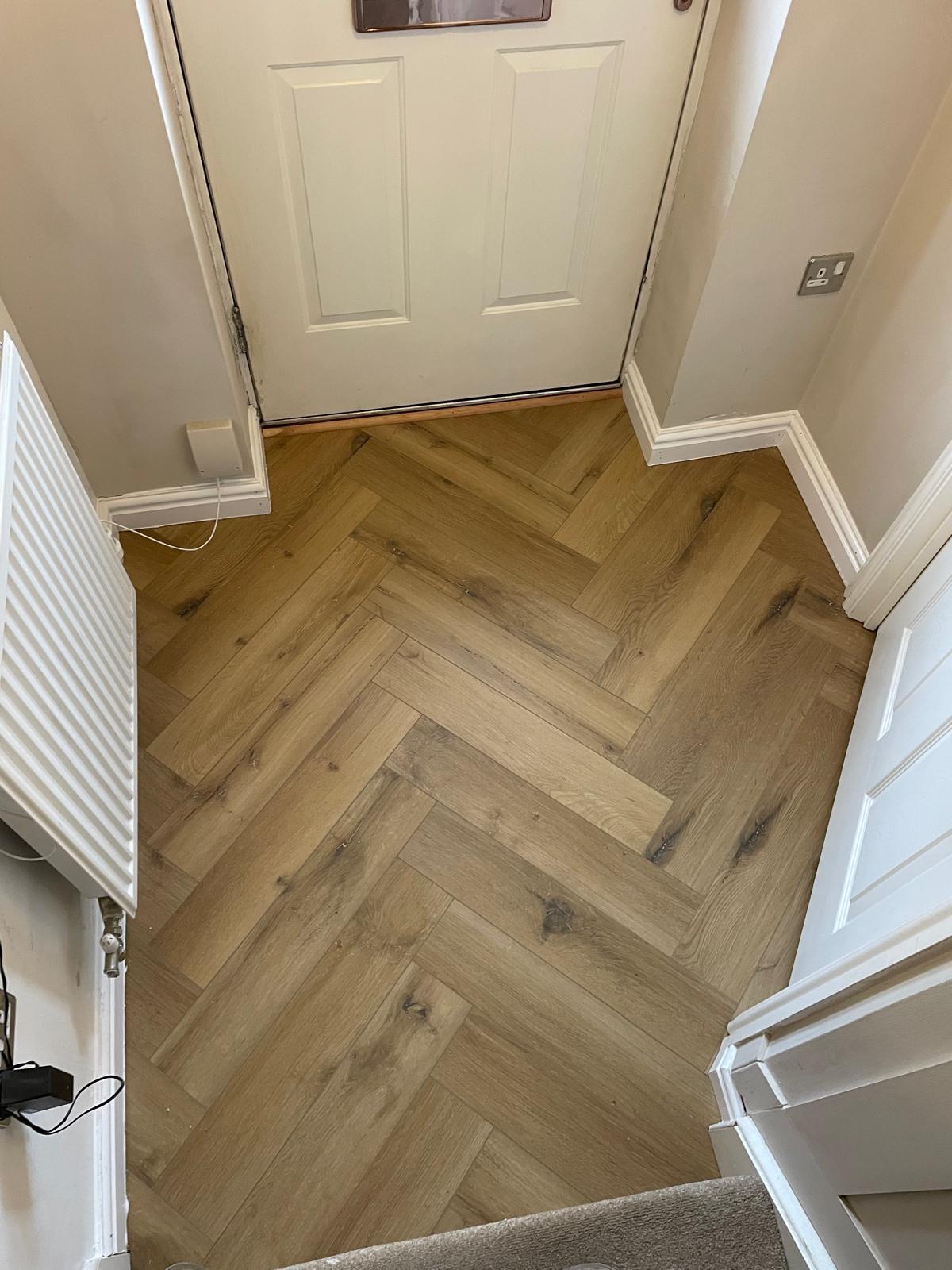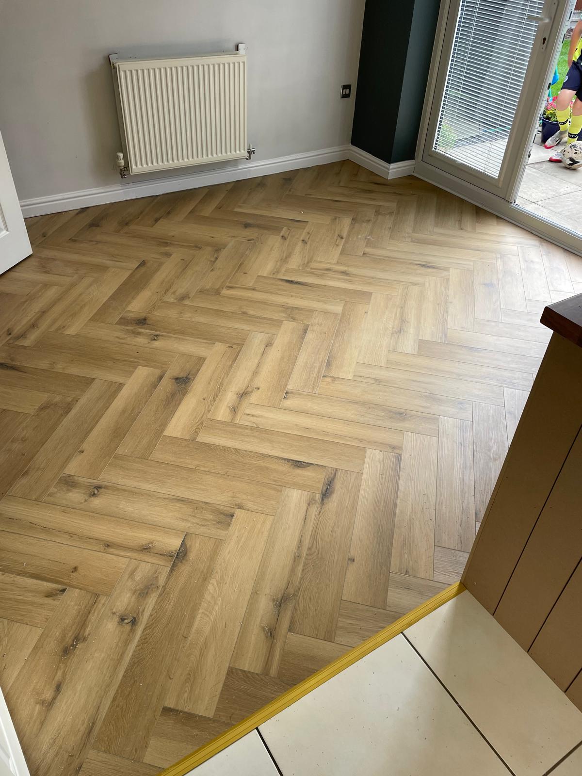 Carpet and skirting removed. Floor screeded and herringbone flooring laid. New skirting fitted and a bit of paneling installed around the breakfast bar. North Hykeham