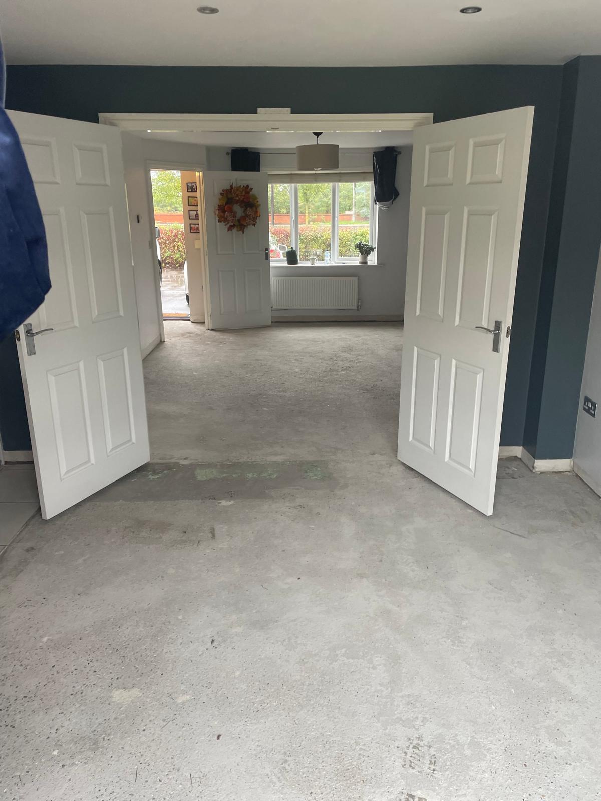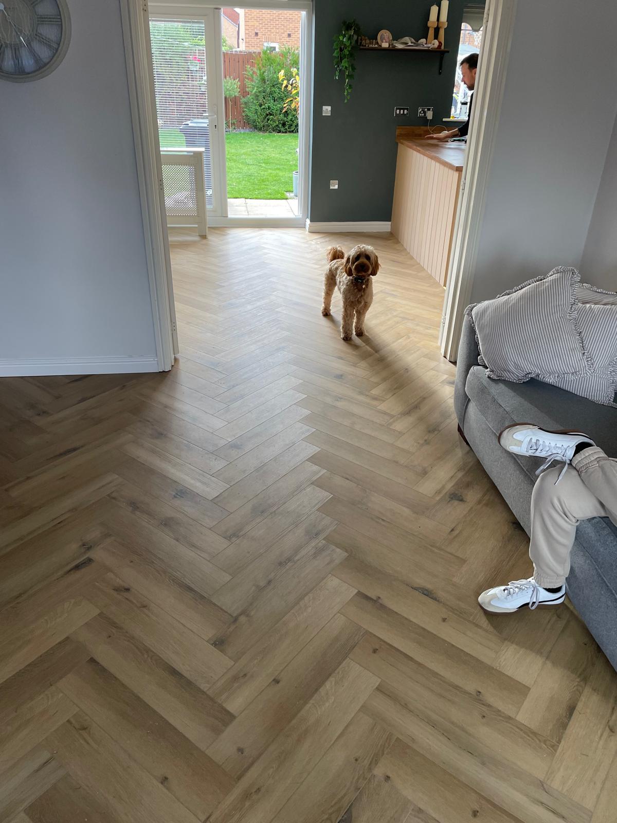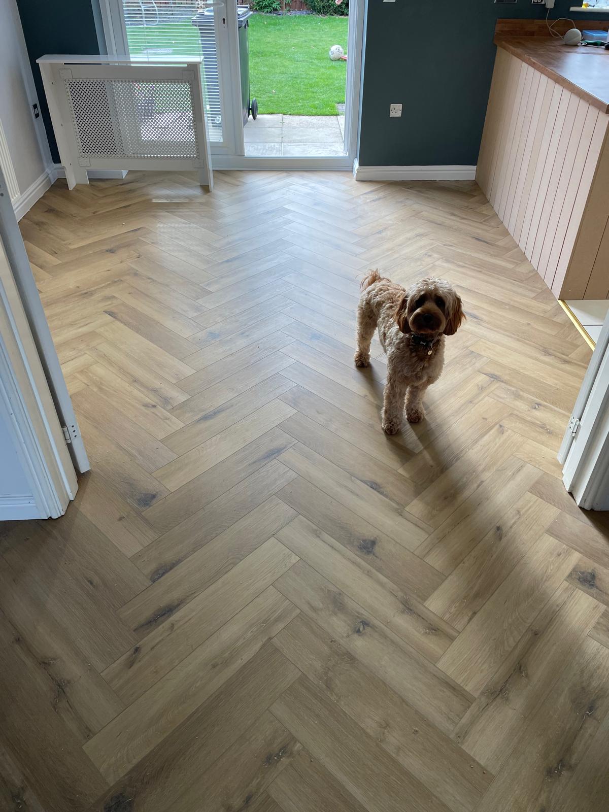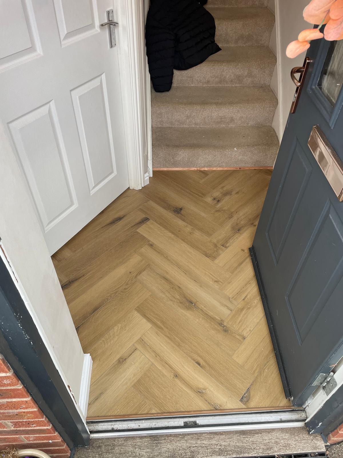 Carpet and skirting removed. Floor screeded and herringbone flooring laid. New skirting fitted and a bit of paneling installed around the breakfast bar. North Hykeham