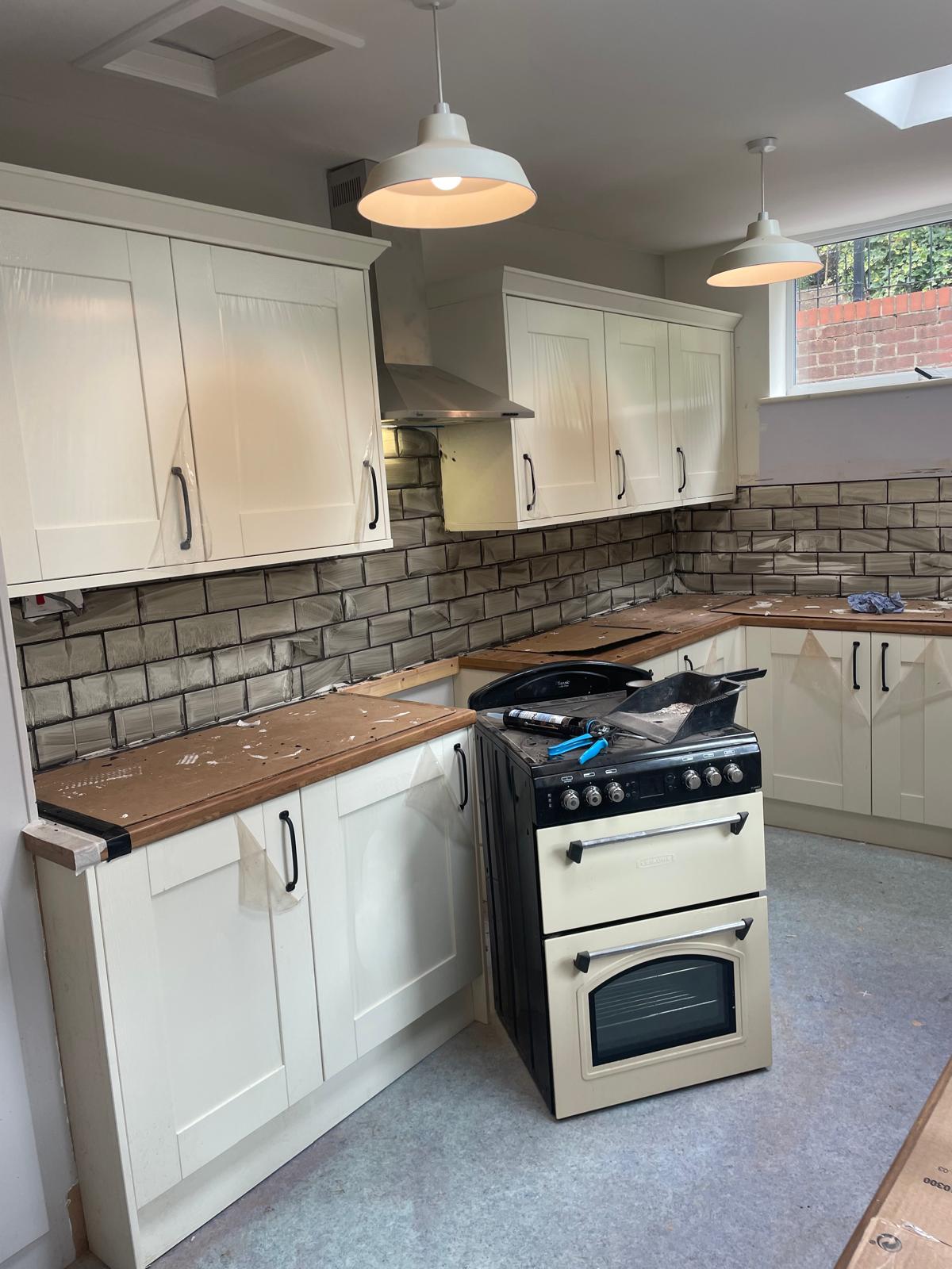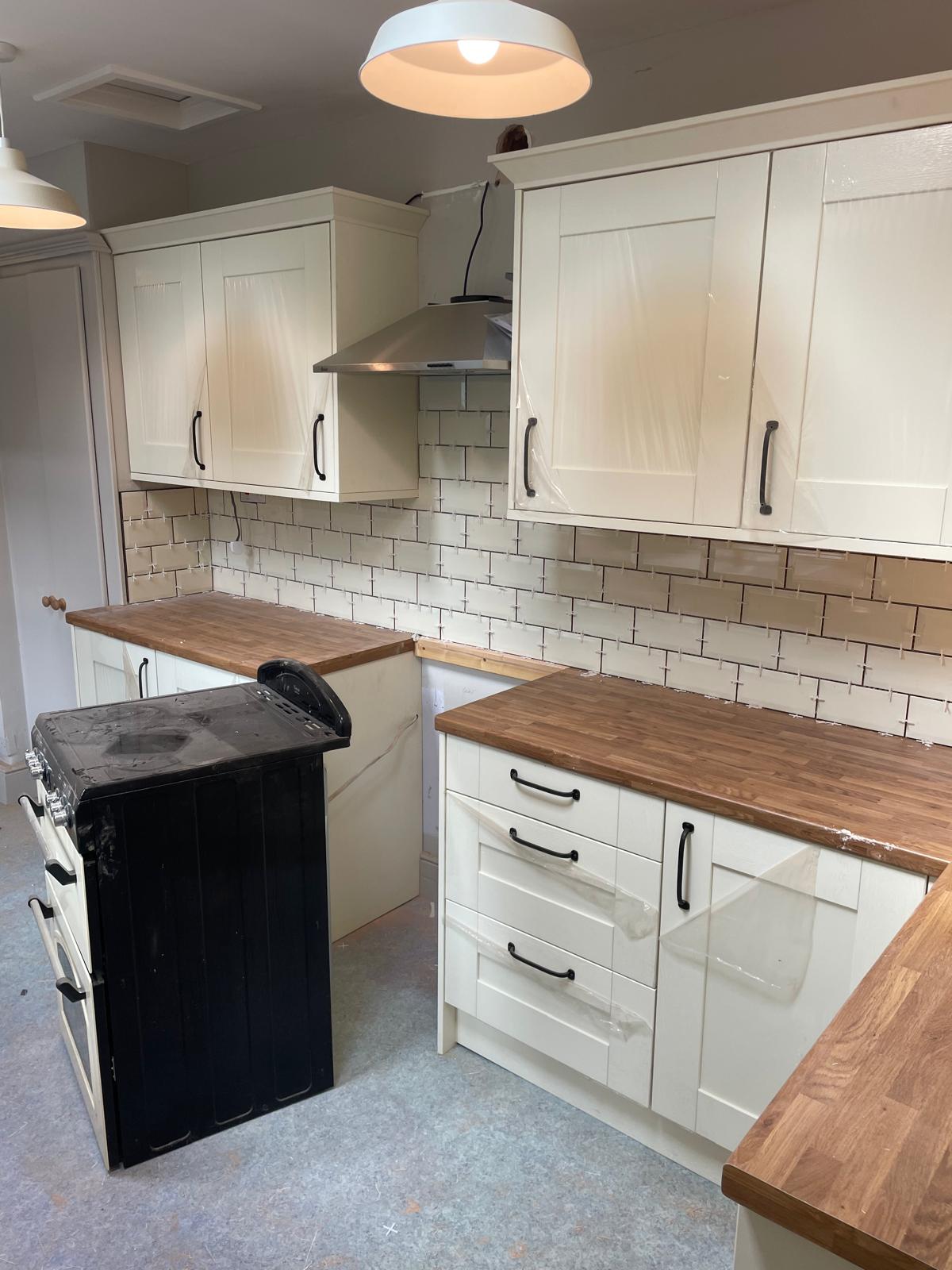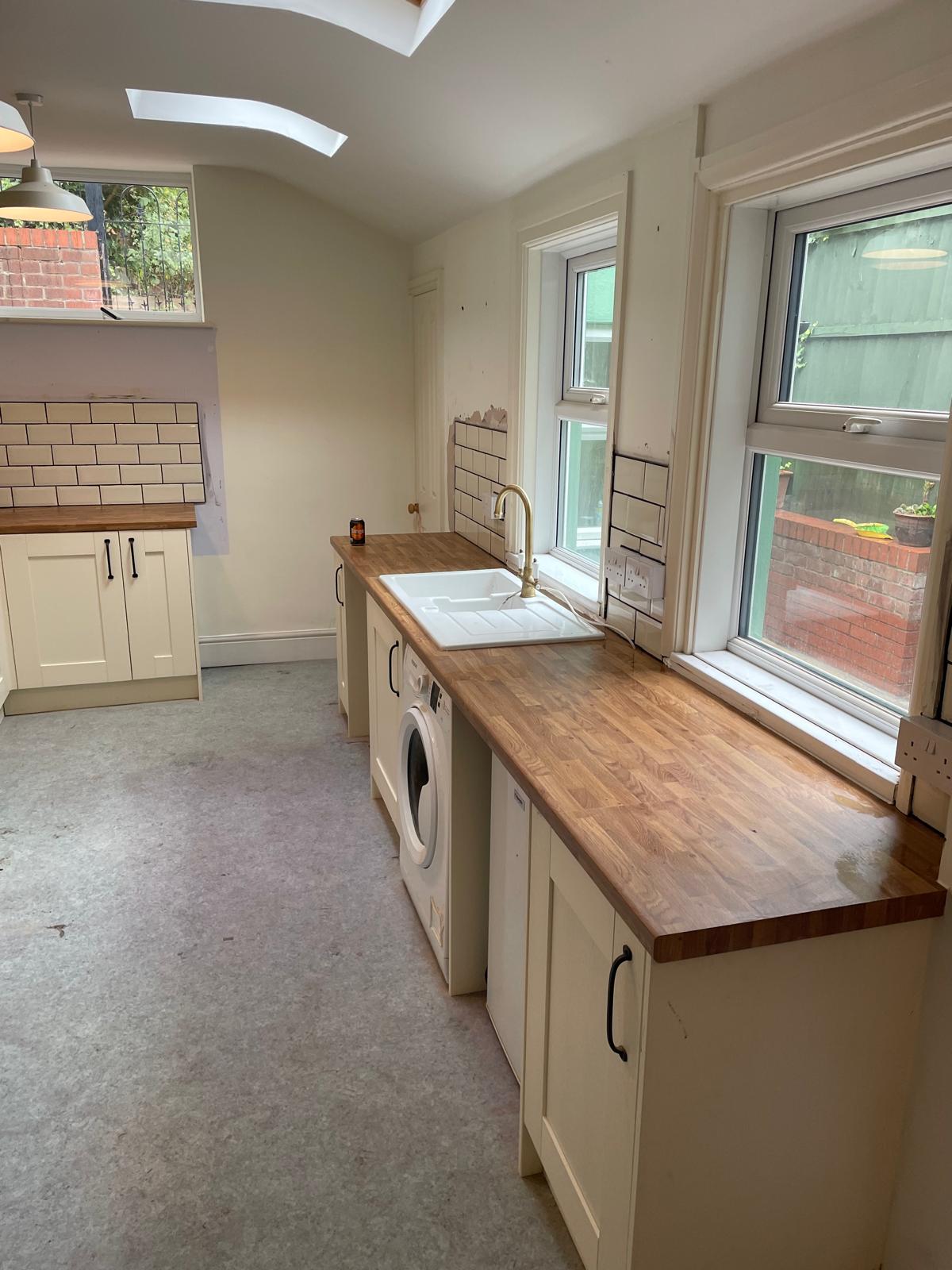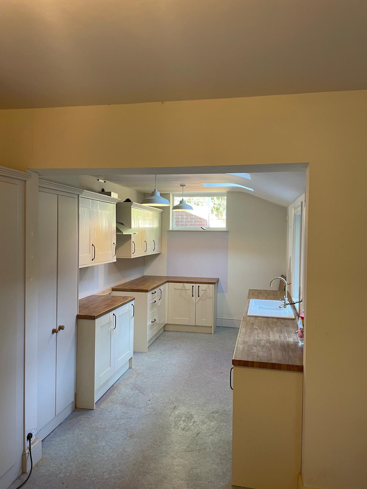 Full kitchen rip out. New kitchen fitted, tiled splash back and a couple of additional sockets added.