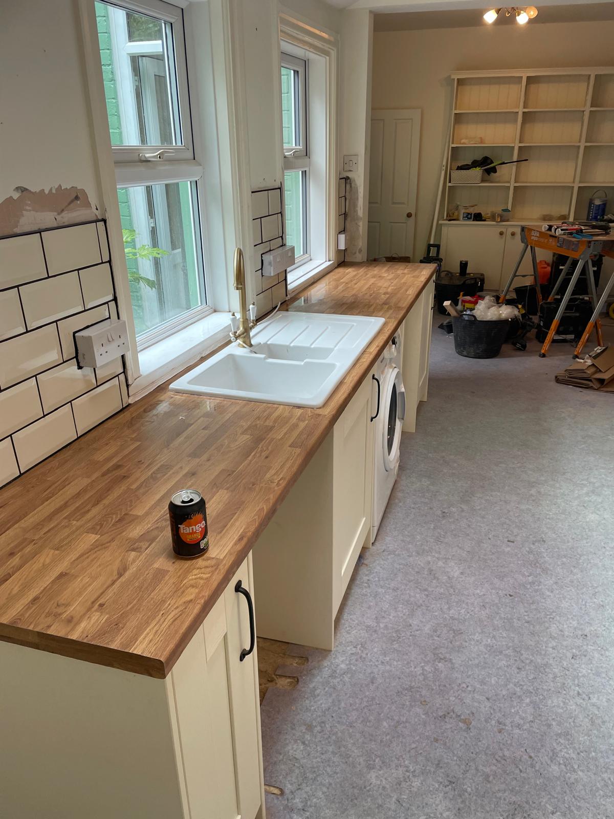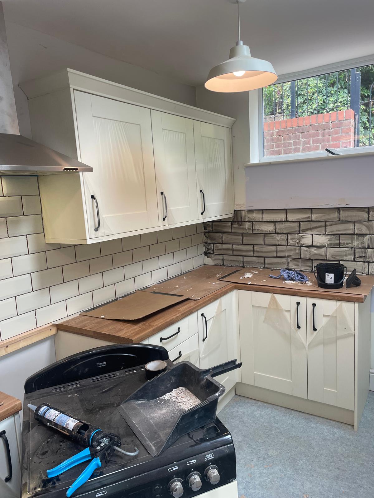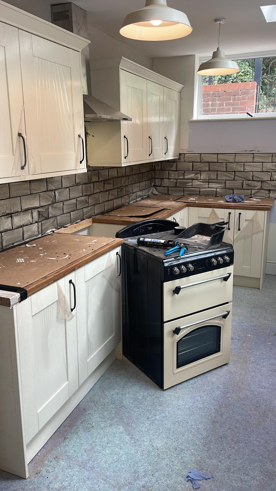 Full kitchen rip out. New kitchen fitted, tiled splash back and a couple of additional sockets added.
