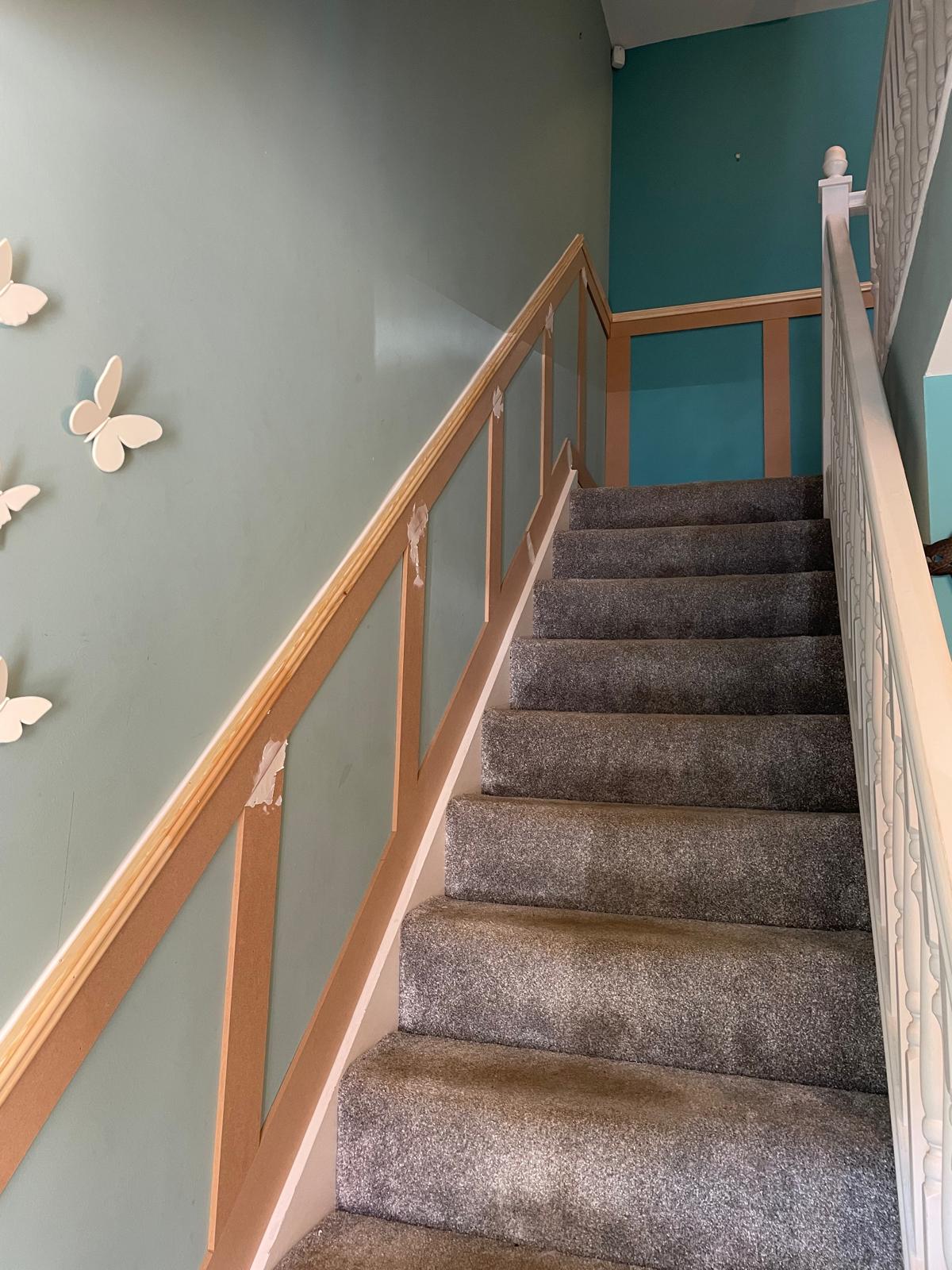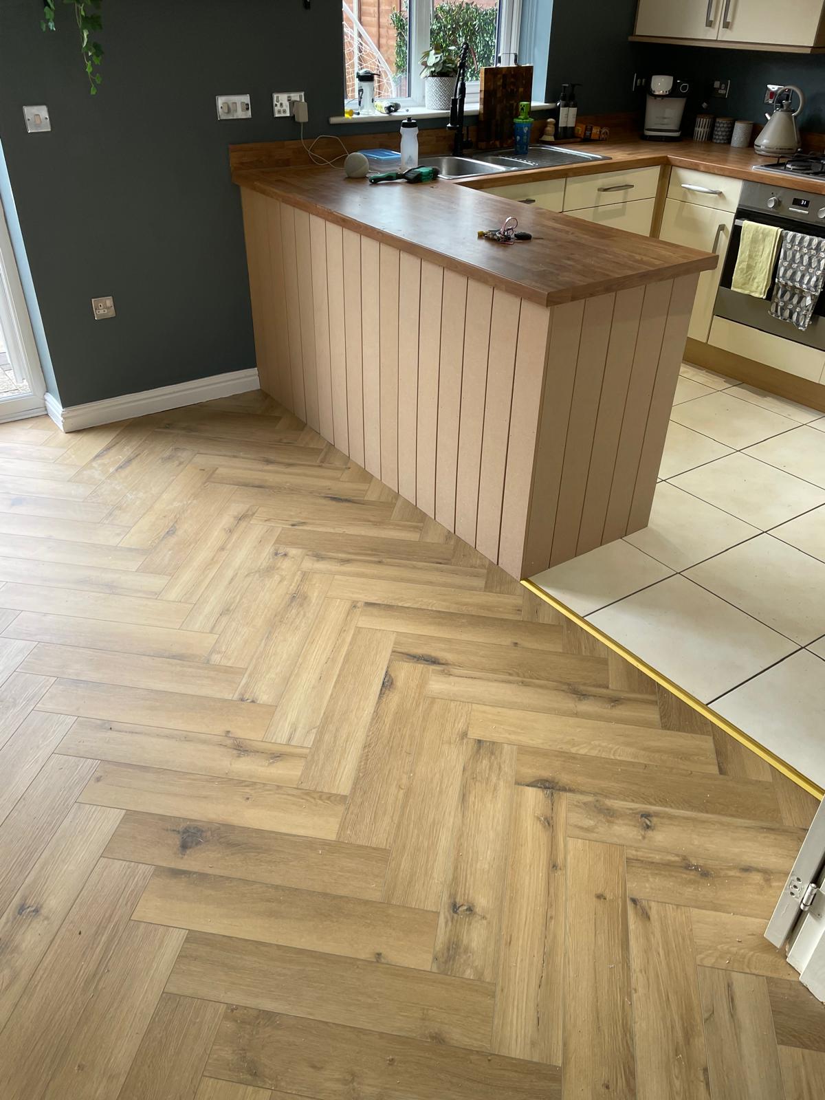 Carpet and skirting removed. Floor screeded and herringbone flooring laid. New skirting fitted and a bit of paneling installed around the breakfast bar. North Hykeham